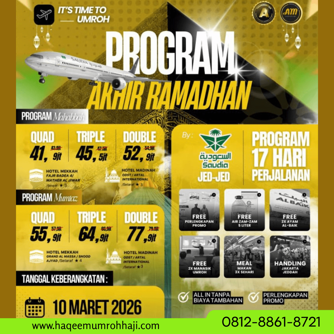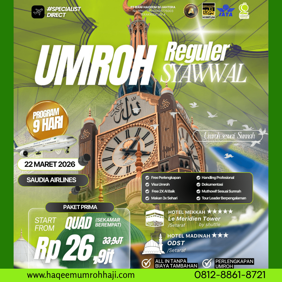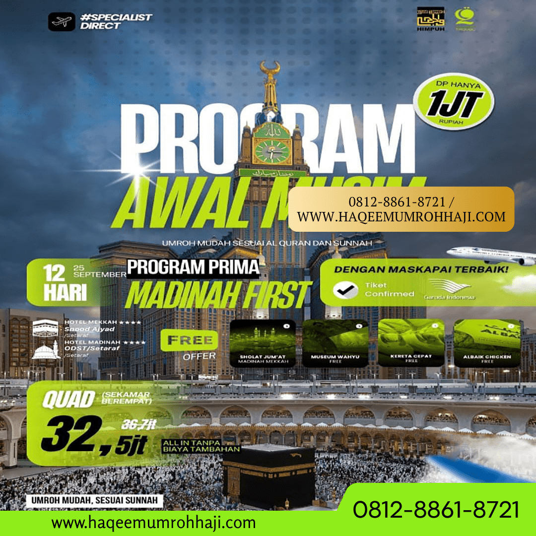 Haqeem Travel adalah penyelenggara perjalanan umroh resmi dengan Izin PPIU No. 02210019007760003. Kami berkomitmen menjadi mitra yang terpercaya, sunah, amanah, profesional dan jujur dalam mendampingi para tamu Allah menuju Baitullah. Dengan pelayanan terbaik, kami berupaya membantu Anda mencapai ibadah umroh yang penuh keberkahan dan diterima oleh-Nya.